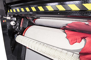 The rotary press for ironing and printing uses the “Thermotech” revolutionary patented heating system of the anti-crease belt. In fact, our machines begin heating the hide from the first instant it enters the machine, through special patented anti-crease belts, which heat approximately one metre of the hide above and/or below at the desired temperature (max. 110°).